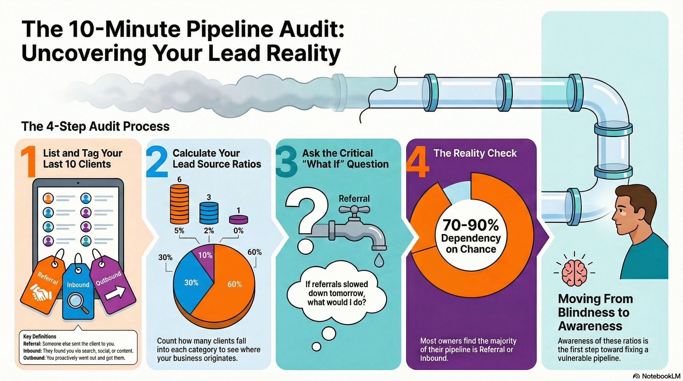 Step 3: Do the Math Count how many fall into each category. Most business owners find that 70-90% of their pipeline is Referral or Inbound β meaning they're almost entirely dependent on others or on chance.